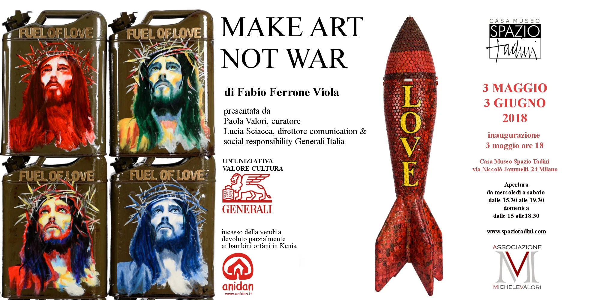 MILANO - Impegno sociale e partecipazione del pubblico, queste le premesse con cui l’artista Fabio Ferrone Viola sbarca a Milano con “MAKE ART NOT WAR”, mostra presentata dall’Associazione Michele Valori con il sostegno di Generali Italia, nei suggestivi spazi della Casa Museo Spazio Tadini. L’iniziativa, provocatoria fin dal titolo, dopo la trasformazione dei rifiuti urbani in opere d’arte nella recente esposizione romana “CRUSH” al Vittoriano, prende ora spunto dal famoso slogan pacifista anni ’60. “Make art not war” è il nuovo disperato appello dell’artista contro le armi. Ferrone Viola, da sempre impegnato da sempre a denunciare l’incuria e l’inquinamento ambientale, non poteva restare indifferente anche di fronte ai temi della guerra, trovando nell’arte ancora una volta riflessione critica e azione di denuncia.